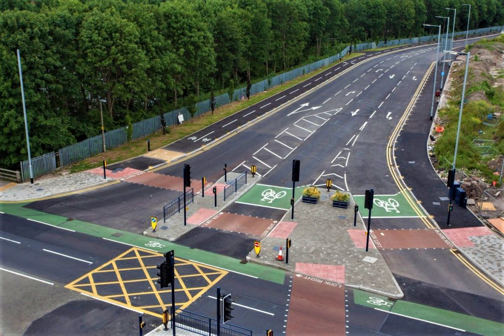 It features cycle lanes in both directions along one side of Lord Sheldon Way with a footway in both directions on the opposite side. On the stretch past Ryecroft Hall in Audenshaw, heading towards Manchester, cycle lanes will be created on both sides.