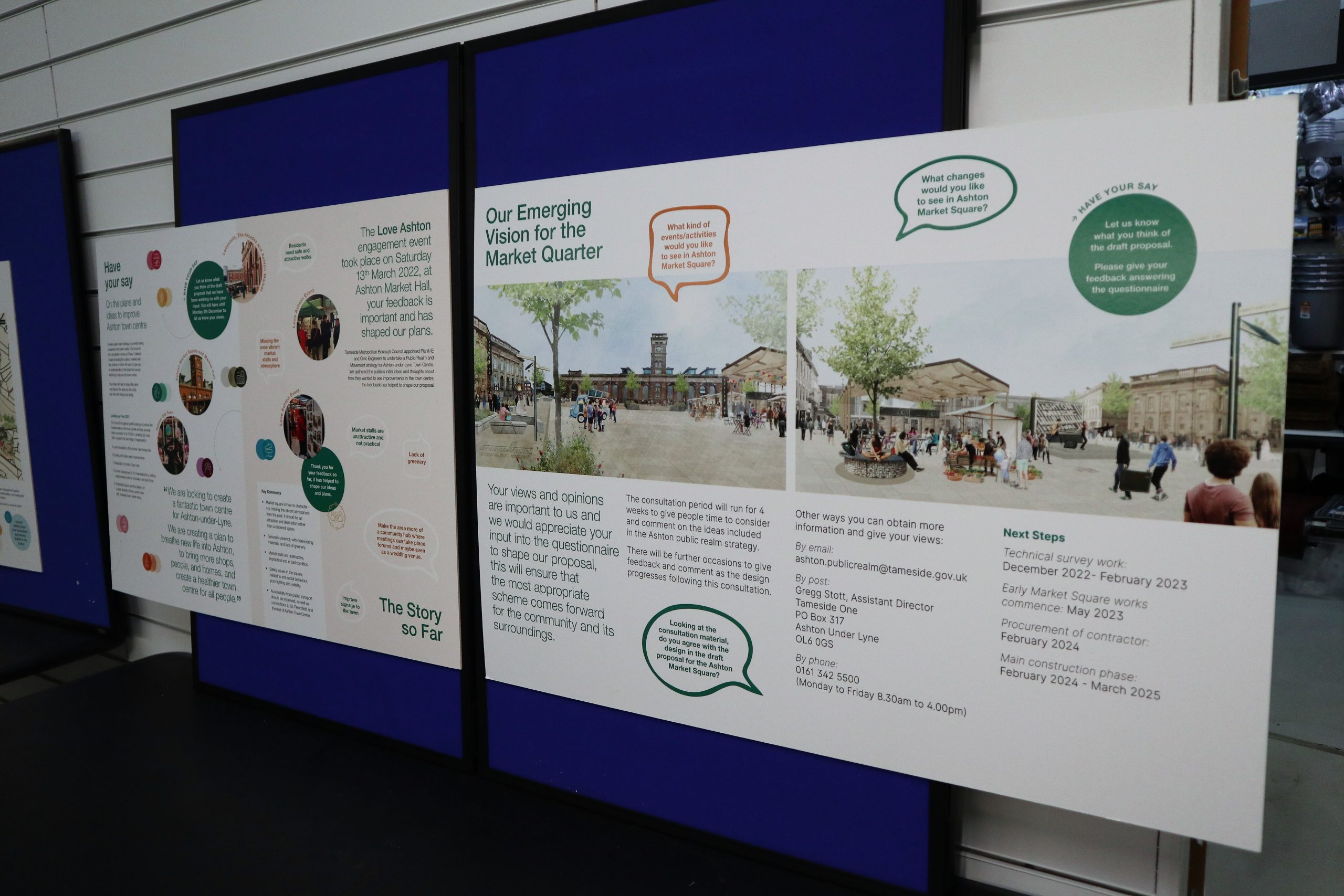 As a regular Sunday trader it reminds me of the buzz and bustle of the old market before the council decided to improve it. In my view creating more green and open space would just create more space for the undesirables. The area for the open space and events just needs finishing. Leave the market stalls as they are, improve them by painting the roofing in the by gone colours, put wood wrapping around the metal and put shutters on them to stop the vandalism, mix the traditional with the modern, traditional market stalls, not less, and the modern space opposite the town hall. Tameside has already got rid of its outdoor markets in the other towns and the new plans are to get rid of Ashton’s once and for all. The trams take everyone out of Ashton not bring them in and carrying on with this design will just kill Ashton Town centre off once and for all. Improve on what you’ve got instead of destroying it all and get the tradition back try and get some of the history back and use this to develop and sell Ashton Town center. The people are afraid of coming into Ashton because of the unsociable behaviour and how dour the place is. Come down on a Sunday and take in the atmosphere of what and how the market stalls should be