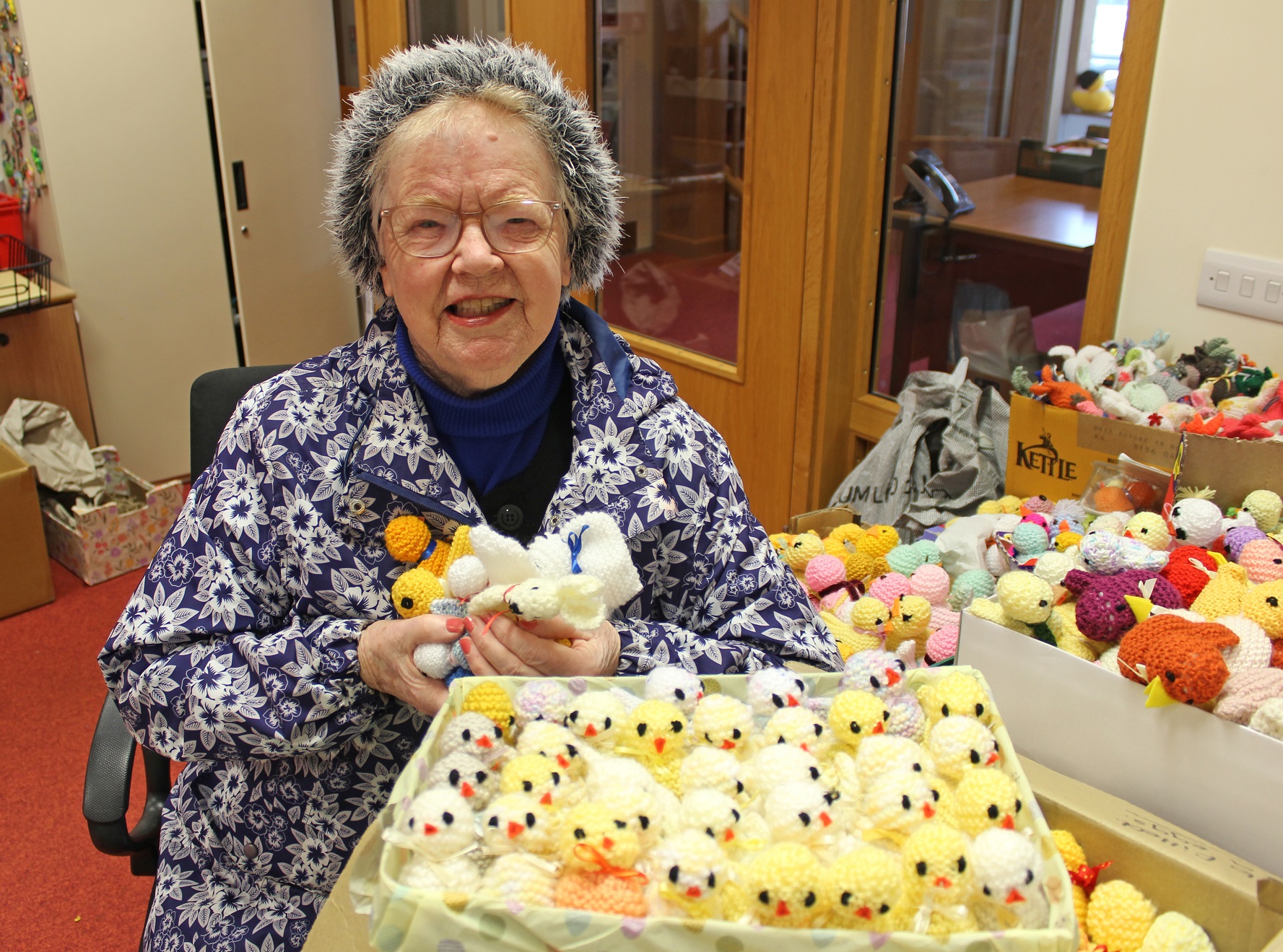 She was one of many knitters who picked up their needles after the hospice’s appeal to send in characterful knitted Easter chicks and bunnies.
