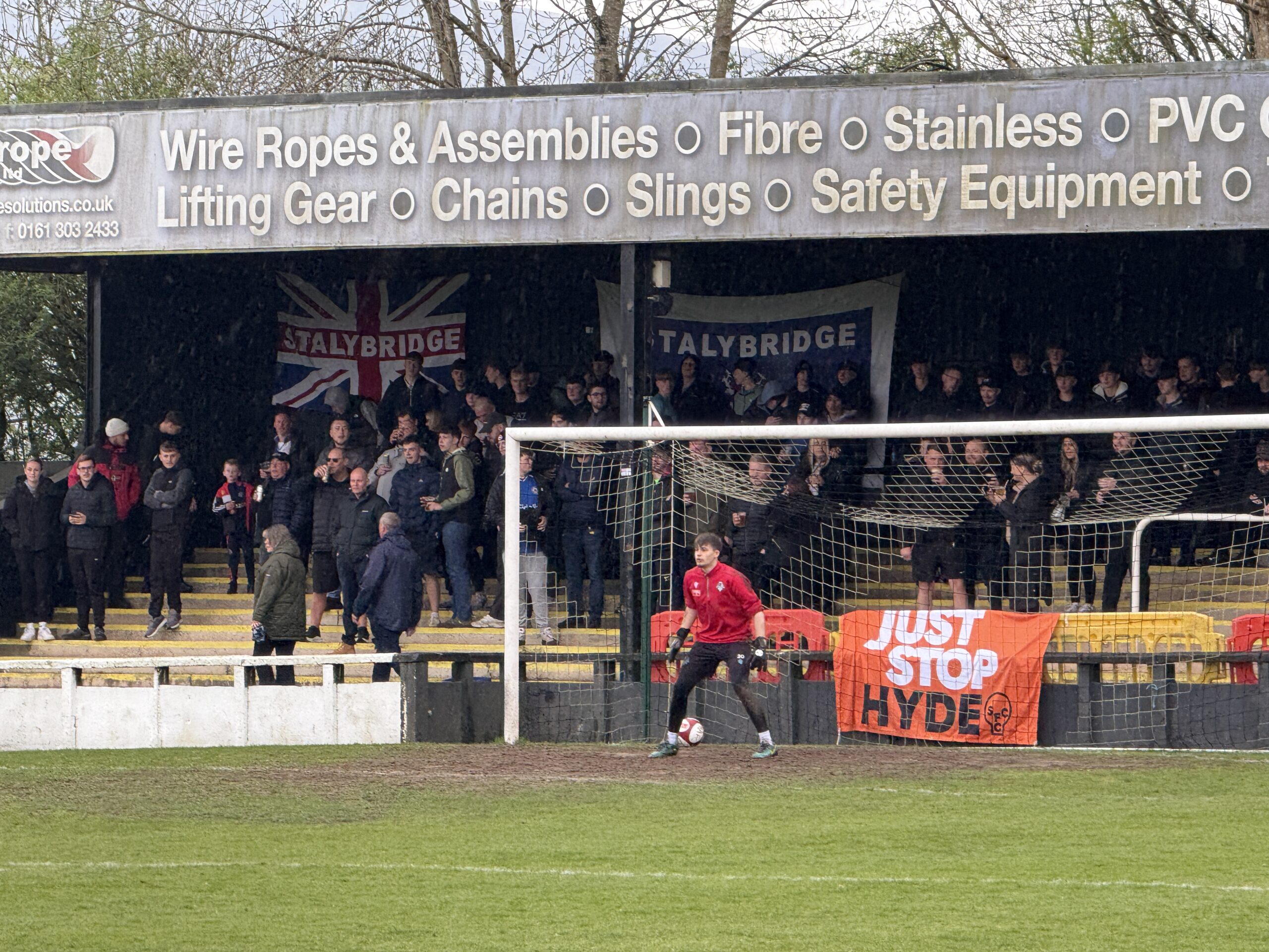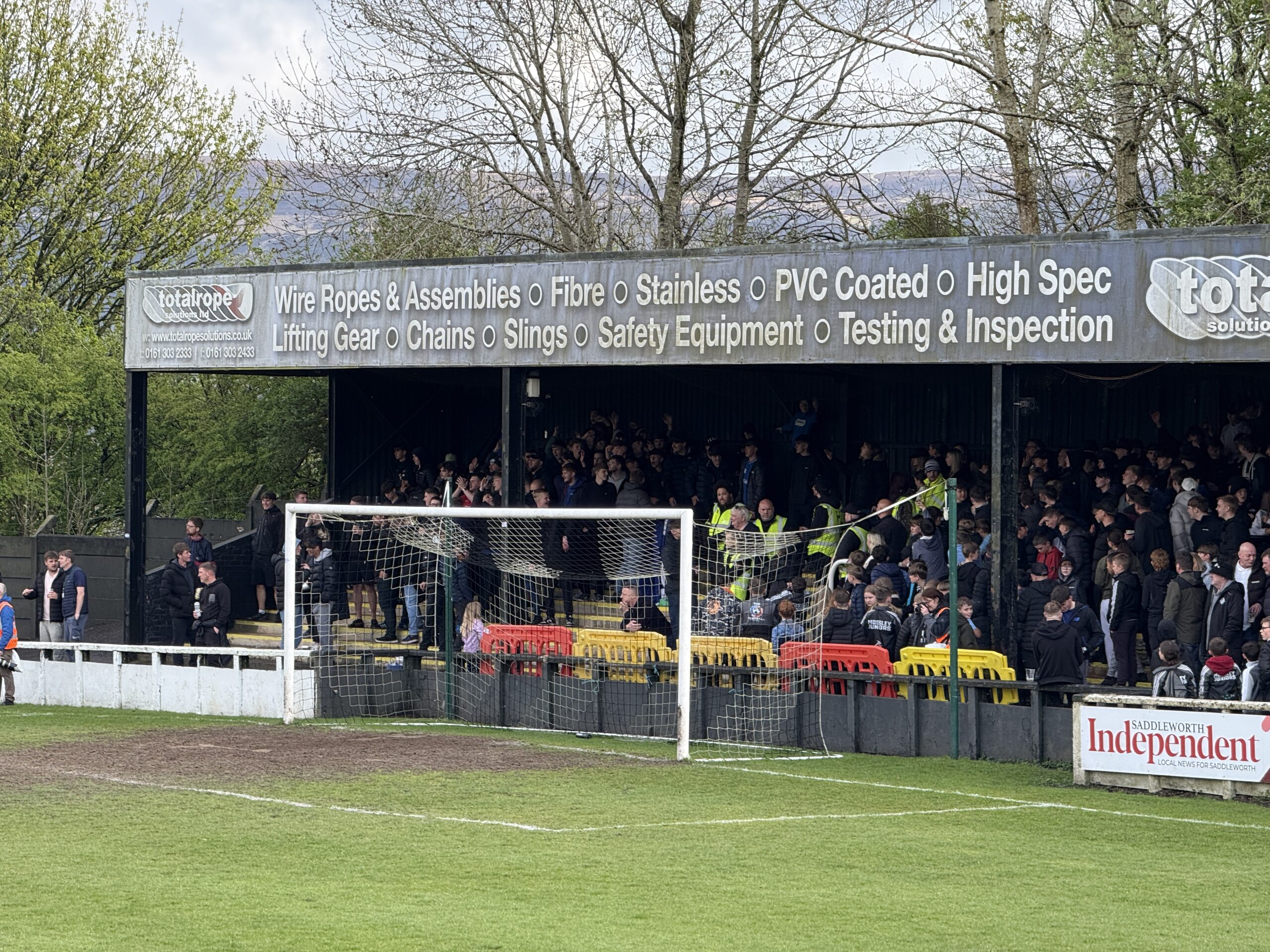Punches were seen to be thrown and drinks aimed at rival groups of supporters during Mossley AFC’s 2-2 draw with Stalybridge Celtic on Easter Monday, April 21.