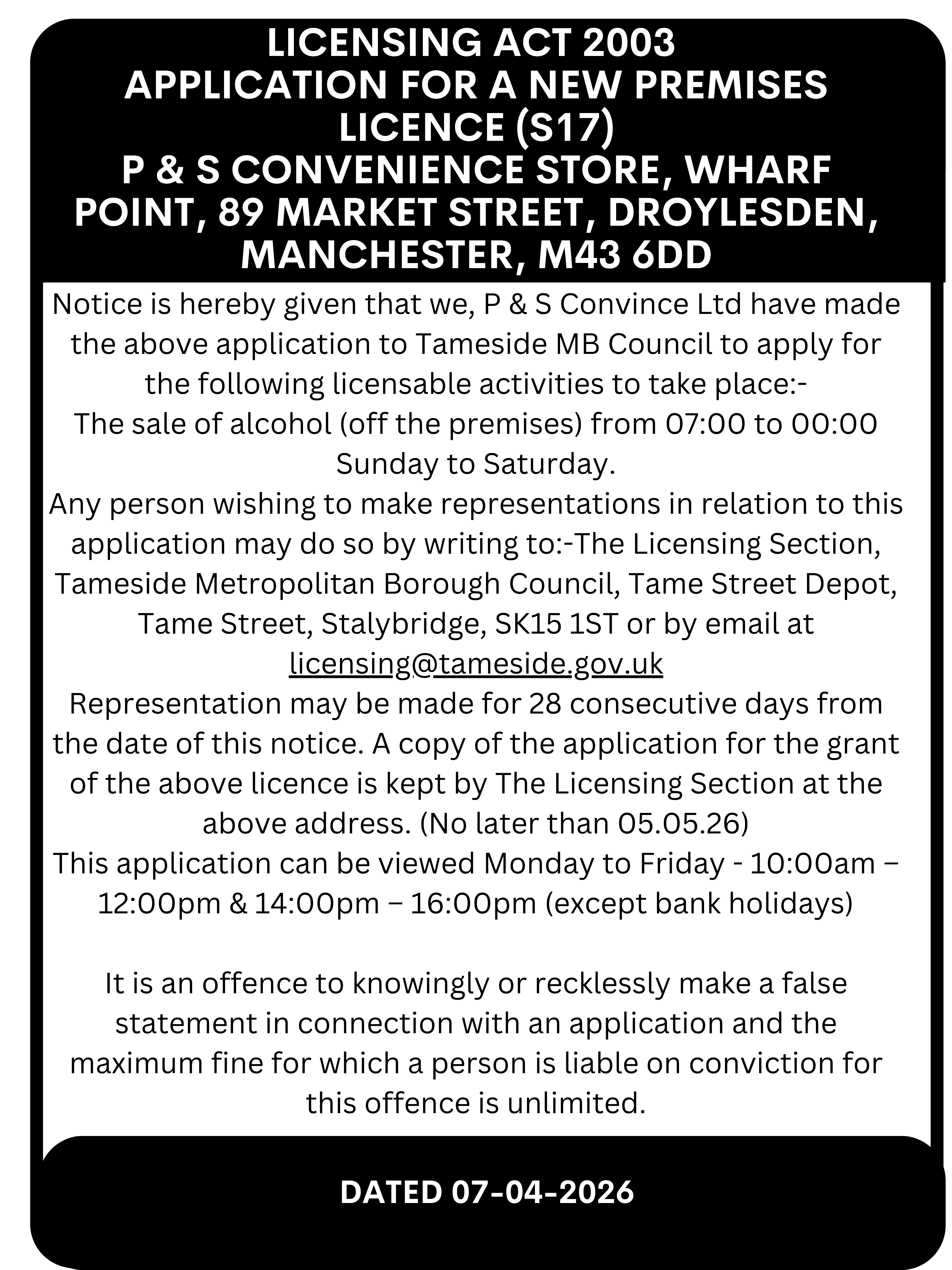 Notices Public notice: Application for a new Premises Licence (s17) P & S Convenience store, Wharf Point, 89 Market Street, Droylsden Gemma Carter April 13, 2026 89 Market StreetdroylsdenPublic notice: Application for a new Premises Licence (s17) P & S Convenience storeTamesideWharf Point Share this:Tweet Print (Opens in new window) Print Related